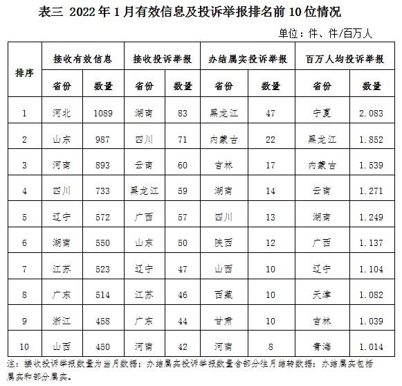 各省(自治區(qū)、直轄市)按照接收的有效信息數(shù)量排序,河北、山東、河南、四川、遼寧、湖南、江蘇、廣東、浙江、山西排在全國(guó)前10位;按照接收的投訴舉報(bào)數(shù)量排序,湖南、四川、云南、黑龍江、廣西、山東、遼寧、江蘇、廣東、河南排在全國(guó)前10位;按照辦結(jié)屬實(shí)的投訴舉報(bào)數(shù)量排序,黑龍江、內(nèi)蒙古、吉林、湖南、四川、陜西、山西、西藏、甘肅、河南排在全國(guó)前10位;按照百萬人均投訴舉報(bào)數(shù)量排序,寧夏、黑龍江、內(nèi)蒙古、云南、湖南、廣西、遼寧、天津、吉林、青海排在全國(guó)前10位。(2022年1月有效信息及投訴舉報(bào)排名前10位情況見表三)