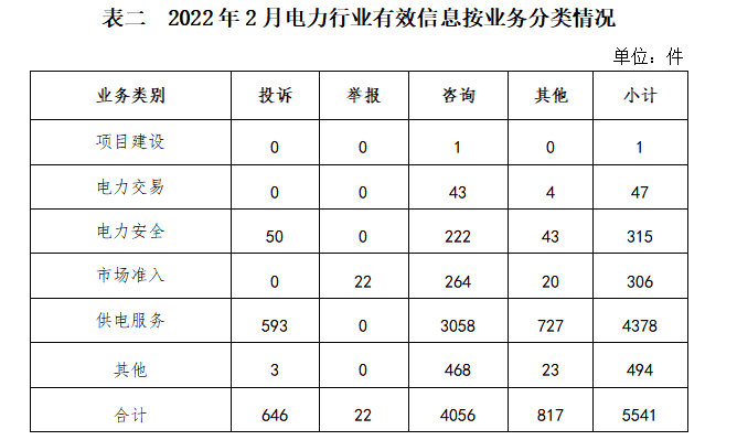 2022年2月,國(guó)家能源局12398能源監(jiān)管熱線(以下簡(jiǎn)稱12398熱線)共收到有效信息8366件(包含投訴、舉報(bào)、咨詢和其他訴求類別),環(huán)比減少30.68%,同比增加10.27%。(2022年2月收到有效信息情況見表一)