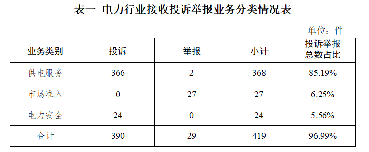 電力行業(yè)排在首位,數(shù)量為419件、占投訴舉報總數(shù)的96.99%,主要集中在供電服務(wù)、市場準(zhǔn)入、電力安全等方面。