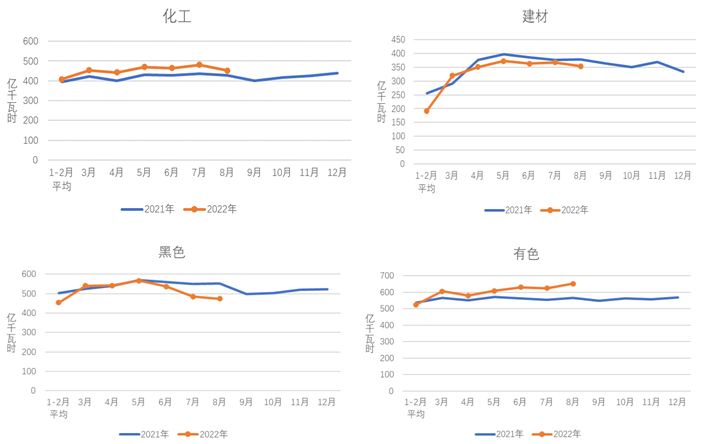 1-8月,化工行業(yè)用電量3621億千瓦時,同比增長4.9%;建材行業(yè)用電量2597億千瓦時,同比下降4.7%;黑色金屬冶煉行業(yè)用電量4095億千瓦時,同比下降5.6%;有色金屬冶煉行業(yè)用電量4927億千瓦時,同比增長2.6%。