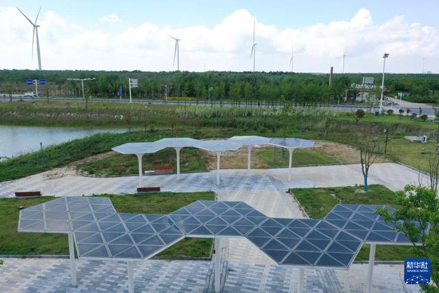 6月6日在射陽港低(零)碳產(chǎn)業(yè)園拍攝的長廊頂部太陽能光伏系統(tǒng)(無人機(jī)照片)。新華社記者 楊磊 攝