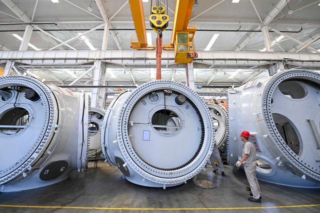 工人在位于山西轉(zhuǎn)型綜合改革示范區(qū)的太重集團新能源產(chǎn)業(yè)園區(qū)吊運風電裝備(2024年5月30日攝)。新華社記者 楊晨光 攝