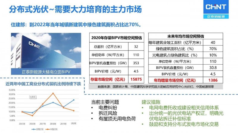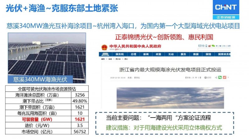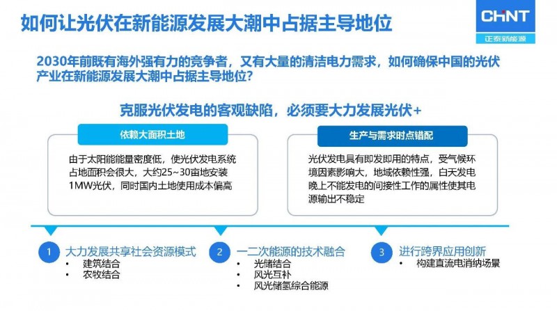 2021年2月3日,由中國光伏行業(yè)協(xié)會主辦的“光伏行業(yè)2020年發(fā)展回顧與2021年形勢展望網(wǎng)絡(luò)研討會”上,浙江正泰新能源開發(fā)有限公司總裁陸川針對我國目前光伏+融合發(fā)展模式趨勢進行了分析。我國已經(jīng)走在了全球光伏+農(nóng)業(yè)行業(yè)的前列,針對農(nóng)光互補電站,他希望能夠推動自上而下的關(guān)于農(nóng)光互補設(shè)施正常補償機制的兌現(xiàn)以促進行業(yè)更優(yōu)發(fā)展。光伏+海漁的合作方式適用于我國東南海岸,克服了東部土地緊張,不但能夠產(chǎn)生發(fā)電效益,同時還能產(chǎn)生漁業(yè)收益。光伏+儲能、光伏+風電、光伏+制氫等均為我國光伏應用新模式做出突出貢獻。戶用光伏的智能化應用、光伏+信號基站的互補應用、光伏+交通實現(xiàn)綠電出行等跨界創(chuàng)新的光伏應用模式也將逐漸推廣,實現(xiàn)全社會層面的綠電應用。