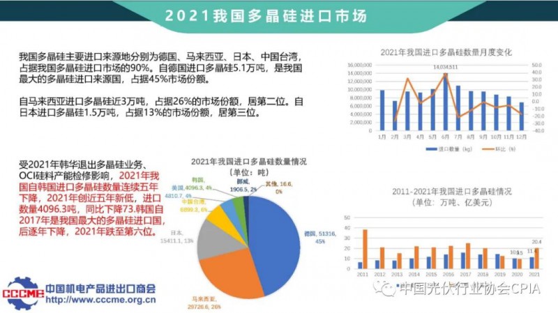 中國機電產(chǎn)品進出口商會光伏分會秘書長張森介紹光伏產(chǎn)品國際貿(mào)易情況。2021年我國光伏產(chǎn)業(yè)規(guī)模、對外貿(mào)易量持續(xù)擴大,行業(yè)發(fā)展主要痛點是光伏貿(mào)易摩擦再次升級、海運費和匯率大幅上漲等。