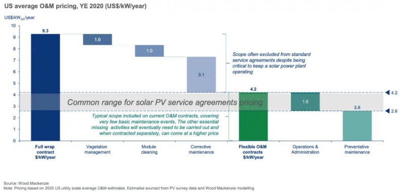 伍德麥肯茲光伏運(yùn)維成本模型,預(yù)測(cè)全部關(guān)鍵的維護(hù)活動(dòng)和現(xiàn)場(chǎng)管理活動(dòng)所產(chǎn)生的支出。這有利于分析各種因素對(duì)總體運(yùn)維成本的影響。因?yàn)榇笮凸夥?xiàng)目的成本主要取決于特定設(shè)備的維護(hù),所以隨著光伏系統(tǒng)平均安裝容量的增加成本效益會(huì)逐步下降。