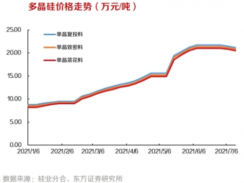 或許是在大擴(kuò)產(chǎn)的預(yù)期下,近期硅料普遍價(jià)格由大漲轉(zhuǎn)向松動(dòng)。根據(jù)硅業(yè)分會(huì)數(shù)據(jù),上周國(guó)內(nèi)單晶復(fù)投料成交均價(jià)下滑至 20.81 萬元/噸,周環(huán)比降幅為 1.61%;單晶致密料成交均價(jià)下滑至 20.6 萬元/噸,周環(huán)比降幅為 1.06%;單晶菜花料成交均價(jià)下滑至 20.35 萬元/噸,周環(huán)比降幅 0.73%。