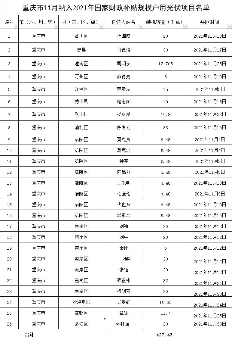 經(jīng)我公司統(tǒng)計,重慶市今年11月申請納入2021年國家財政補貼規(guī)模的戶用光伏項目共有27個,裝機容量為487.43千瓦。1-11月申請納入2021年國家財政補貼規(guī)模的戶用光伏項目共有140個,裝機容量2584.51千瓦?,F(xiàn)按要求公示如下: