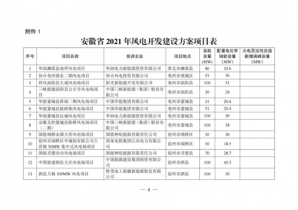12月6日,安徽省能源局關于印發(fā)2021年風電、光伏發(fā)電開發(fā)建設方案的通知。其中,光伏并網(wǎng)容量4574MW,要求配置電化學儲能容量961.5 MW,火電靈活性改造新增調(diào)峰容量619.6MW。風電裝機容量1426MW,要求配置電化學儲能容量600.4 MW,火電靈活性改造新增調(diào)峰容量349.7MW。且規(guī)定電化學儲能電站連續(xù)儲能時長為1小時。