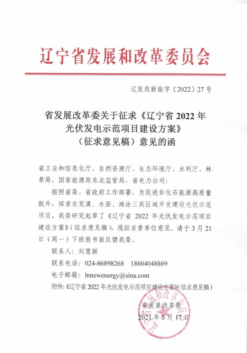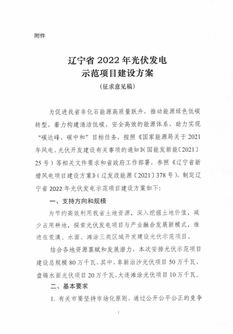 近日,遼寧省發(fā)改委下發(fā)《遼寧省2022年光伏發(fā)電示范項目建設(shè)方案》(征求意見稿)。文件表示,為節(jié)約高效利用我省土地資源,深入挖掘土地價值,減少占用耕地,探索光伏發(fā)電項目與產(chǎn)業(yè)融合發(fā)展新模式,推進在荒漠、水面、灘涂三類區(qū)域開發(fā)建設(shè)光伏示范項目。結(jié)合各地資源稟賦和發(fā)展?jié)摿?,本次安排光伏示范項目建設(shè)總規(guī)模80萬千瓦,其中,阜新治沙光伏項目50萬千瓦、盤錦水面光伏項目20萬千瓦、大連灘涂光伏項目10萬千瓦。
