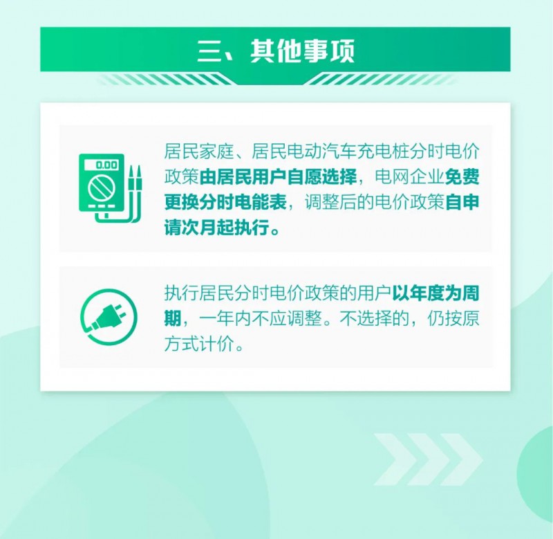 根據(jù)通知,居民家庭、居民電動(dòng)汽車充電樁分時(shí)電價(jià)政策由居民用戶自愿選擇,電網(wǎng)企業(yè)免費(fèi)更換分時(shí)電能表,調(diào)整后的電價(jià)政策自申請(qǐng)次月起執(zhí)行。執(zhí)行居民分時(shí)電價(jià)政策的用戶以年度為周期,一年內(nèi)不應(yīng)調(diào)整。不選擇的,仍按原方式計(jì)價(jià)。