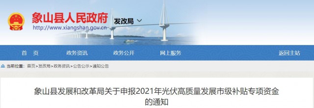 7月5日,浙江象山縣發(fā)展和改革局關(guān)于申報2021年光伏高質(zhì)量發(fā)展市級補貼專項資金的通知發(fā)布。