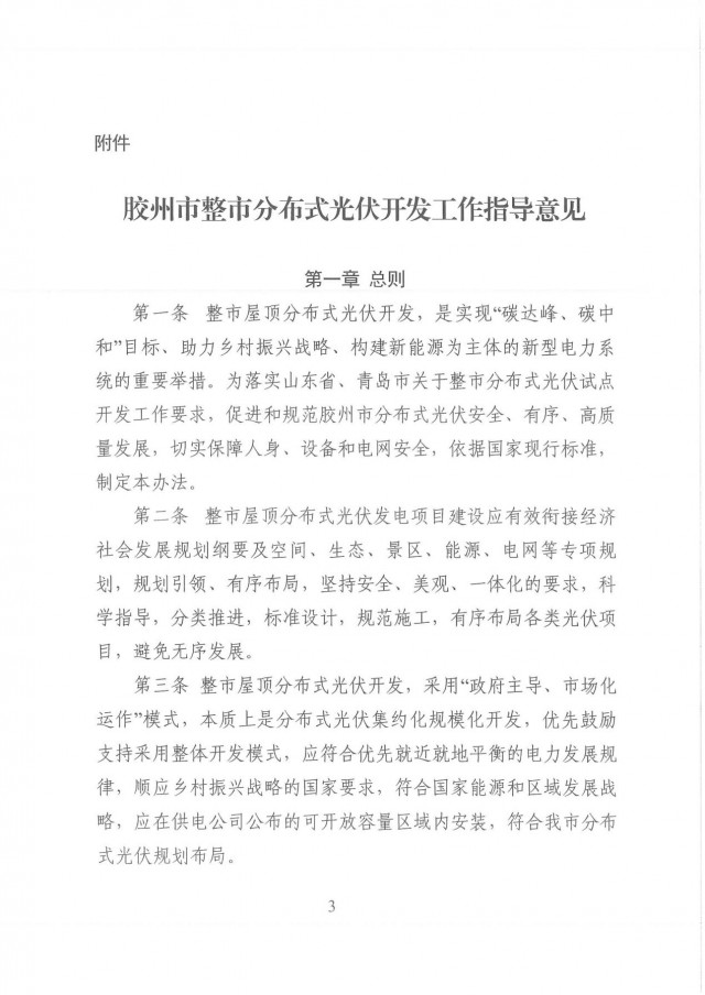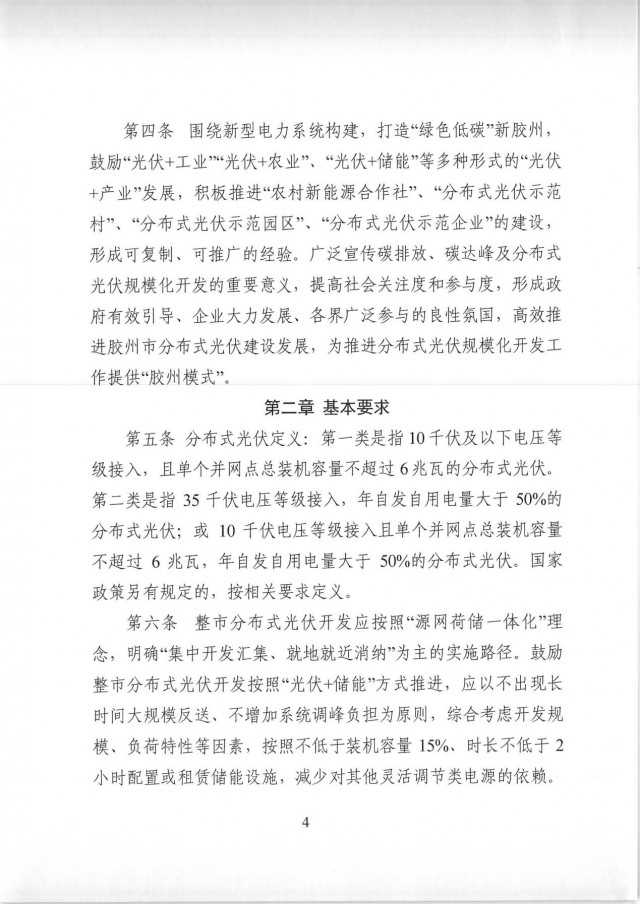 近日,山東膠州市發(fā)改委發(fā)布了《膠州市整市分布式光伏開發(fā)工作指導(dǎo)意見》。文件要求,整市分布式光伏開發(fā)應(yīng)按照“源網(wǎng)荷儲(chǔ)一體化”理念,明確“集中開發(fā)匯集、就地就近消納”為主的實(shí)施路徑。鼓勵(lì)整市分布式光伏開發(fā)按照“光伏+儲(chǔ)能”方式推進(jìn),應(yīng)以不出現(xiàn)長(zhǎng)時(shí)間大規(guī)模反送、不增加系統(tǒng)調(diào)峰負(fù)擔(dān)為原則,綜合考慮開發(fā)規(guī)模、負(fù)荷特性等因素,按照不低于裝機(jī)容量15%、時(shí)長(zhǎng)不低于2小時(shí)配置或租賃儲(chǔ)能設(shè)施,減少對(duì)其他靈活調(diào)節(jié)類電源的依賴。