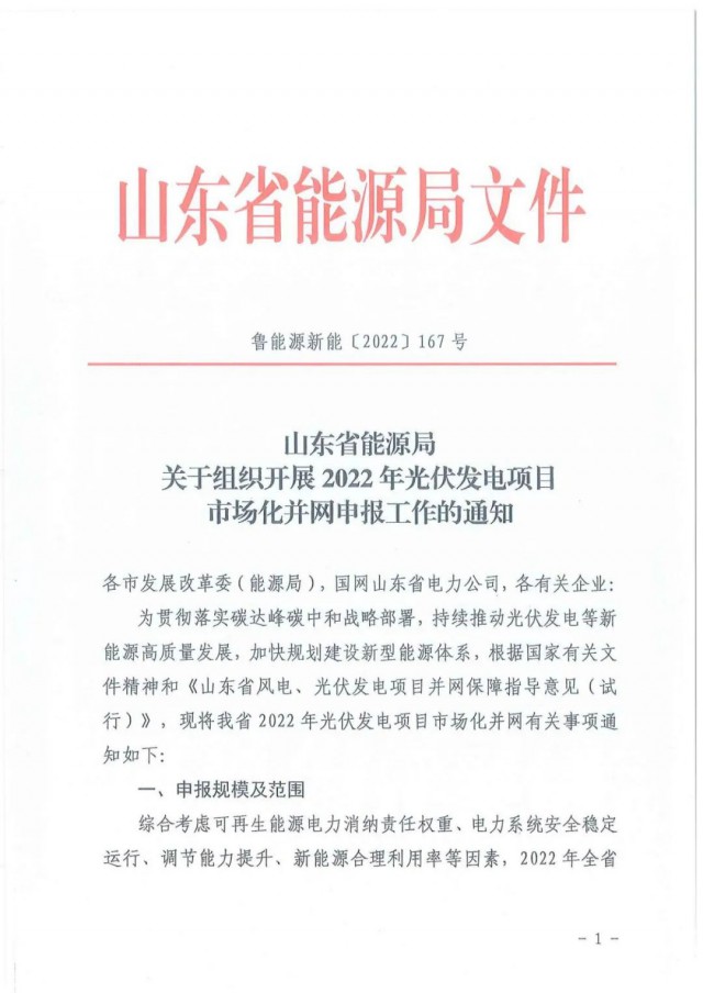 為貫徹落實(shí)碳達(dá)峰碳中和戰(zhàn)略部署,持續(xù)推動光伏發(fā)電等新能源高質(zhì)量發(fā)展,加快規(guī)劃建設(shè)新型能源體系,根據(jù)國家有關(guān)文件精神和《山東省風(fēng)電、光伏發(fā)電項目并網(wǎng)保障指導(dǎo)意見(試行)》,現(xiàn)將我省2022年光伏發(fā)電項目市場化并網(wǎng)有關(guān)事項通知如下: