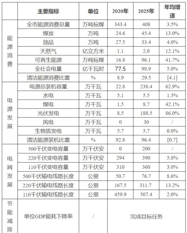 ——能源安全保障目標(biāo)。到2025年,電力裝機(jī)容量達(dá)238.4萬(wàn)千瓦,清潔能源裝機(jī)容量達(dá)229.7萬(wàn)千瓦,占電力總裝機(jī)容量的96.4%;新增110千伏以上輸電線路210公里以上,新增變電容量346萬(wàn)千伏安;完善城市天然氣管網(wǎng)建設(shè),新建江南門(mén)站、高中壓調(diào)壓站2座,新建次高壓管網(wǎng)16公里、中壓管網(wǎng)370公里以上。
