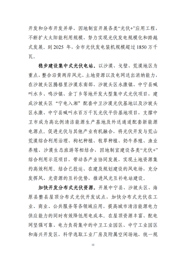 穩(wěn)步建設(shè)集中式光伏電站。在沙坡頭區(qū)騰格里沙漠東南部、沙坡頭區(qū)永康鎮(zhèn)、中寧縣喊叫水鄉(xiāng)、鳴沙鎮(zhèn)、余丁鄉(xiāng)等地開(kāi)發(fā)大型集中式光伏項(xiàng)目,建成沙坡頭區(qū)“寧電入湘”配套中衛(wèi)沙漠光伏基地以及沙坡頭區(qū)永康、中寧縣喊叫水百萬(wàn)千瓦光伏平價(jià)基地項(xiàng)目,支撐中衛(wèi)市成為高比例清潔能源生產(chǎn)基地及外送通道配套新能源電源點(diǎn)。促進(jìn)光伏與其他產(chǎn)業(yè)有機(jī)融合,將光伏開(kāi)發(fā)與荒山荒漠綜合利用治理、枸杞種植、牧草種植、奶牛養(yǎng)殖、漁業(yè)養(yǎng)殖、沙漠生態(tài)旅游等相結(jié)合,因地制宜建設(shè)各類(lèi)“光伏+”綜合利用示范項(xiàng)目,帶動(dòng)各產(chǎn)業(yè)協(xié)同發(fā)展,實(shí)現(xiàn)土地資源集約高效利用。結(jié)合已投運(yùn)、在建及規(guī)劃建設(shè)的風(fēng)電場(chǎng),充分發(fā)揮風(fēng)、光資源的互補(bǔ)優(yōu)勢(shì),推進(jìn)風(fēng)光互補(bǔ)電站建設(shè)。