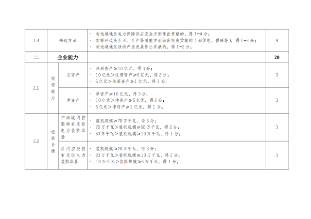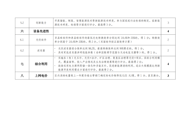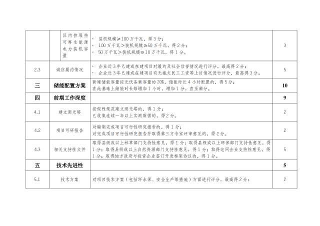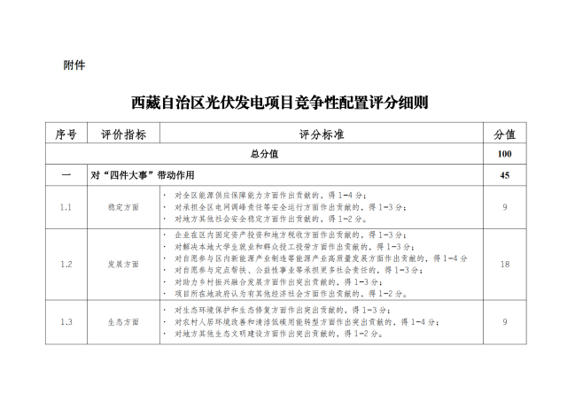 西藏自治區(qū)光伏發(fā)電項(xiàng)目競(jìng)爭(zhēng)性配置評(píng)分細(xì)則規(guī)定了儲(chǔ)能配置方案,評(píng)分滿分為100分,其中儲(chǔ)能滿分為10分。新建儲(chǔ)能容量按光伏備案容量的20%,儲(chǔ)能時(shí)長(zhǎng)4小時(shí)配置的,得5分;在此基礎(chǔ)上儲(chǔ)能時(shí)長(zhǎng)每增加1小時(shí),增加1分,直至滿分。