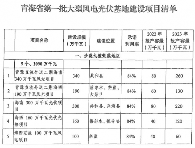 2022年8月24日,青海省能源局在“關(guān)于加強(qiáng)海南州清潔能源產(chǎn)業(yè)建設(shè)的建議”——省十三屆人民代表大會(huì)第七次會(huì)議第224014號(hào)建議答復(fù)的函上表示,省第二批大型風(fēng)電光伏基地取得重大進(jìn)展,7個(gè)項(xiàng)目、合計(jì)700萬(wàn)千瓦納入第二批以沙漠、戈壁、荒漠地區(qū)為重點(diǎn)的大型風(fēng)電光伏基地建設(shè)項(xiàng)目清單,其中隆發(fā)共和100萬(wàn)千瓦源網(wǎng)荷儲(chǔ)項(xiàng)目、中能建江蘇設(shè)計(jì)院/江蘇美科共和100萬(wàn)千瓦源網(wǎng)荷儲(chǔ)項(xiàng)目、伏山共和100萬(wàn)千瓦源網(wǎng)荷儲(chǔ)項(xiàng)目、中電建共和100萬(wàn)千瓦光伏光熱項(xiàng)目共400萬(wàn)落地海南州共和縣。