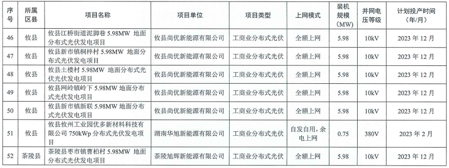 根據(jù)清單,株洲市2023年工商業(yè)分布式光伏項目共計52個,規(guī)模合計153.341MW,計劃投產(chǎn)時間均在2023年內。