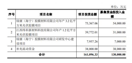 項(xiàng)目的實(shí)施主體為綠康(海寧)膠膜材料有限公司,實(shí)施地點(diǎn)為浙江省海寧市黃灣鎮(zhèn)海市路35號。項(xiàng)目總投資為75,367.06萬元,擬使用募集資金投入54,000.00萬元。本項(xiàng)目建設(shè)期為12個(gè)月,項(xiàng)目建設(shè)完成后將新增16,000萬平方米POE光伏膠膜、12,000萬平方米EVA光伏膠膜和4,000萬平方米EPE光伏膠膜產(chǎn)能,有助于公司進(jìn)一步提高光伏膠膜的生產(chǎn)能力和市場占有率,加快業(yè)務(wù)轉(zhuǎn)型步伐,提升公司市場競爭力。