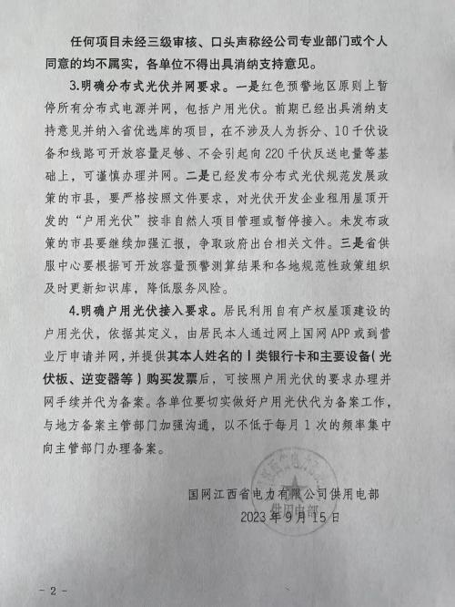 據(jù)網(wǎng)絡(luò)媒體消息:近日,國網(wǎng)江西省下發(fā)《關(guān)于進(jìn)一步明確分布式光伏消納和并網(wǎng)服務(wù)有關(guān)事項(xiàng)的通知》,明確要求紅色預(yù)警地區(qū)暫停戶用光伏并網(wǎng),對(duì)光伏開發(fā)企業(yè)租用屋頂開發(fā)的“戶用光伏”按非自然人項(xiàng)目管理或暫停接入,加強(qiáng)出具“消納意見”的管理,任何項(xiàng)目未經(jīng)三級(jí)審核均不得出具消納意見。