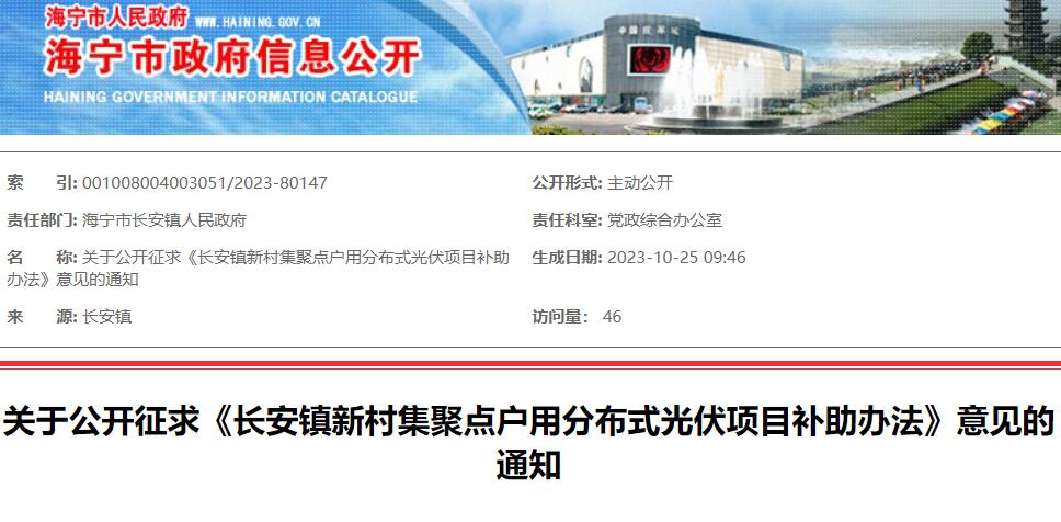 10月25日,浙江海寧市長安鎮(zhèn)人民政府關(guān)于公開征求《長安鎮(zhèn)新村集聚點戶用分布式光伏項目補(bǔ)助辦法》意見的通知。文件指出,為加快統(tǒng)籌推進(jìn)全鎮(zhèn)新村集聚點戶用分布式光伏項目建設(shè),特制《長安鎮(zhèn)新村集聚點戶用分布式光伏項目補(bǔ)助辦法》。