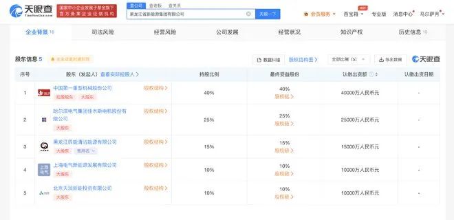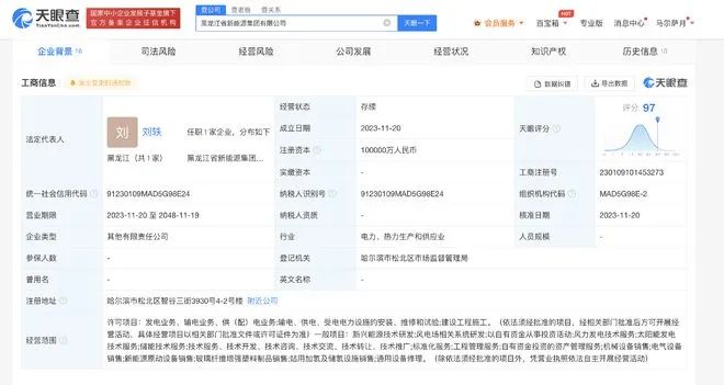 天眼查App顯示,11月20日,黑龍江省新能源集團(tuán)有限公司成立,法定代表人為劉軼,注冊(cè)資本10億人民幣,經(jīng)營范圍含新興能源技術(shù)研發(fā)、風(fēng)電場(chǎng)相關(guān)系統(tǒng)研發(fā)、以自有資金從事投資活動(dòng)、風(fēng)力發(fā)電技術(shù)服務(wù)、太陽能發(fā)電技術(shù)服務(wù)、儲(chǔ)能技術(shù)服務(wù)、工程管理服務(wù)等。股東信息顯示,該公司由中國一重(601106)、佳電股份(000922)、黑龍江辰能清潔能源有限公司、上海電氣新能源發(fā)展有限公司、北京天潤新能投資有限公司共同持股。