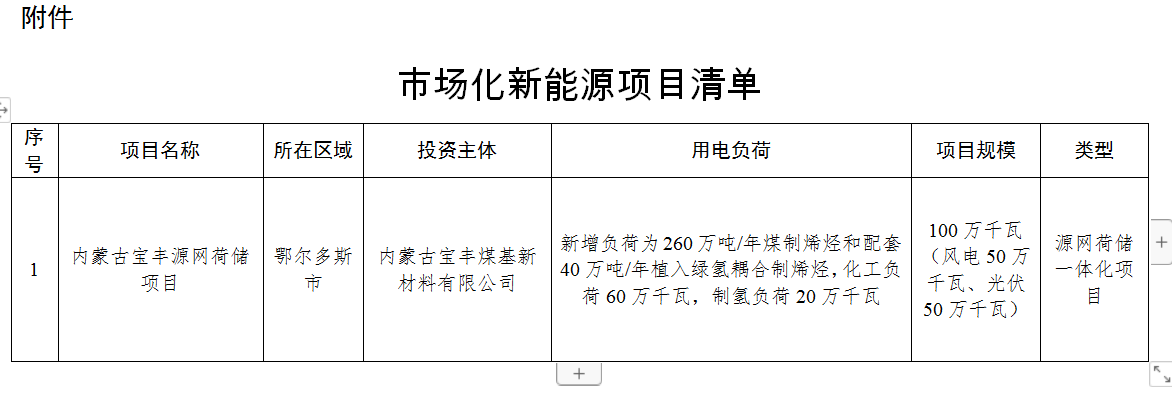 內(nèi)蒙古寶豐源網(wǎng)荷儲一體化項目,新增負荷為260萬噸/年煤制烯烴和配套40萬噸/年植入綠氫耦合制烯烴,化工負荷60萬千瓦,制氫負荷20萬千瓦,新能源建設(shè)規(guī)模為100萬千瓦(其中,風(fēng)電50萬千瓦、光伏50萬千瓦),儲能規(guī)模為20萬千瓦/60萬千瓦時。