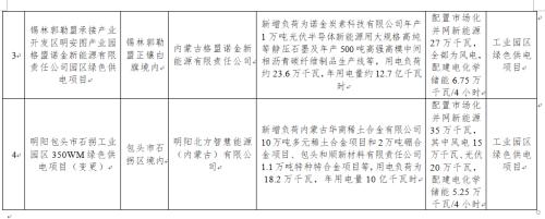 (四)明陽包頭市石拐工業(yè)園區(qū)350WM綠色供電項目。此本項目為變更項目,新增負荷內(nèi)蒙古華商稀土合金有限公司10萬噸多元稀土合金項目和2萬噸硼合金項目、包頭和順新材料有限責任公司1.1萬噸特種特合金項目等,用電負荷為18.2萬千瓦,年用電量10億千瓦時。配置市場化并網(wǎng)新能源35萬千瓦,其中風電15萬千瓦、光伏20萬千瓦,配建電化學儲能5.25萬千瓦/4小時。