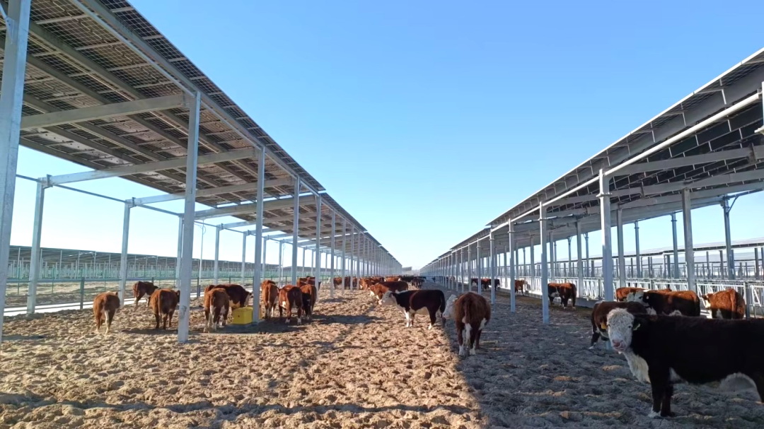 項(xiàng)目分三期建設(shè),一期占地9380畝,建設(shè)內(nèi)容包括育肥牛欄、動(dòng)物保健中心、全混合日糧中心、升壓站及送出線路等設(shè)施。其中,育肥牛欄建設(shè)面積達(dá)150萬平方米,建成后,養(yǎng)殖規(guī)??蛇_(dá)存欄肉牛10萬頭、年出欄肉牛20萬頭,將成為亞洲最大的牧光融合產(chǎn)業(yè)集群。超級牧場內(nèi)育肥牛舍屋頂光伏及草光互補(bǔ)區(qū)地面光伏兩部分組成,光伏總裝機(jī)容量398兆瓦。