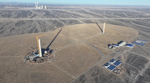在距離格爾木700多公里的甘肅省瓜州縣,三峽集團正在建設全球首個“雙塔一機”風光熱儲一體化項目——三峽能源瓜州70萬千瓦“光熱儲能+”項目,其中的子項目——10萬千瓦光熱項目(以下簡稱“瓜州項目”)是全球首個“雙塔一機”光熱電站。