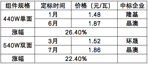 在價格方面,2021年上半年隨著組價集采的推進,組件價格受硅料上漲影響,其報價也呈現快速上漲的趨勢。從年初中核集團第一批1.3GW組件集采,隆基單面450組件報出1.48/瓦元的中標價格,到今年6月蒙能包頭50MW技術領跑項目中晶澳以450單面1.87元/瓦的中標價格拿下上半年“標王”,組件漲幅約26%左右。相較于去年1.55元/瓦的定標均價而言,今年440+組件已經來到1.7元/瓦上下;540雙面則由3月廣東電力第一批組件集采的1.52元/瓦的中標價上漲至7月廣東電力第三批組件集采的1.86元/瓦中標價格,漲幅約22.37%。