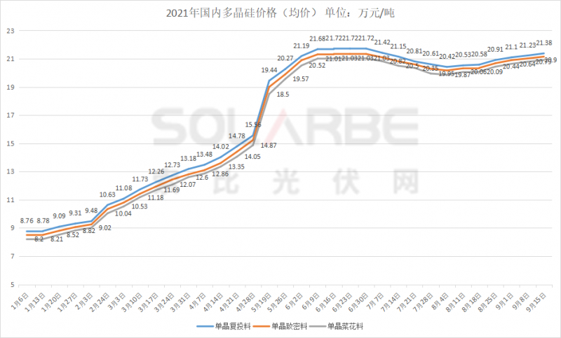 9月15日,硅業(yè)分會(huì)發(fā)布了本周?chē)?guó)內(nèi)多晶硅成交價(jià)。其中單晶復(fù)投料價(jià)格區(qū)間在20.6-21.9萬(wàn)元/噸,成交均價(jià)小幅上漲至21.38萬(wàn)元/噸,周環(huán)比漲幅為0.71%;單晶致密料價(jià)格區(qū)間在20.4-21.7萬(wàn)元/噸,成交均價(jià)上漲至21.15萬(wàn)元/噸,周環(huán)比漲幅為0.62%。