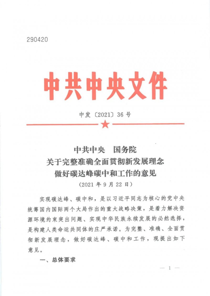 9月22日,中共中央下發(fā)《關(guān)于完整準(zhǔn)確全面貫徹新發(fā)展理念做好碳達(dá)峰碳中和工作的意見》。