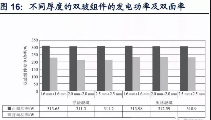 超白浮法玻璃力學(xué)性能更優(yōu),薄化后作為背板的發(fā)電功率接近超白壓延玻璃,陸續(xù)出現(xiàn)組件廠商采用超白浮法玻璃作為背板以降低成本。浮法玻璃表面平整度高,抗沖擊強度較壓延玻璃更為出色,并且隨著厚度降低,二者抗沖擊強度相差拉大,在1.6 mm浮法玻璃平均破碎高度高出超白壓延玻璃達(dá)97.77%。另外,雖然浮法玻璃透過率不如超白壓延玻璃,作為雙玻組件背板后會導(dǎo)致背面發(fā)電功率降低,但隨著厚度減小,二者發(fā)電功率差距逐漸降低,1.6mm雙玻組件下的背面發(fā)電功率相差僅為5.45W。浮法玻璃作為組件背板使用時,雙玻組件正面發(fā)電功率也可達(dá)到壓延玻璃作為背板時的發(fā)電功率。因此陸續(xù)有組件公司為降低生產(chǎn)成本,使用浮法玻璃作為背板。