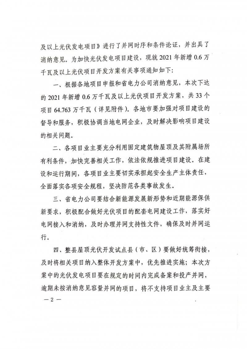本次下達(dá)2021年新增0.6萬(wàn)千瓦及以上光伏項(xiàng)目開(kāi)發(fā)方案,共33個(gè)項(xiàng)目64.763萬(wàn)千瓦。