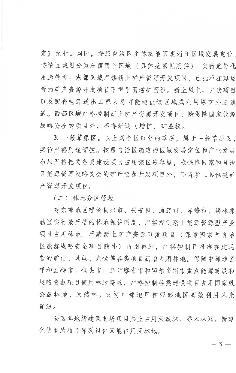 對(duì)東部地區(qū)呼倫貝爾市、興安盟、通遼市、赤峰市、錫林郭勒盟實(shí)行最嚴(yán)格的林地保護(hù)制度,嚴(yán)格控制新上能源資源型產(chǎn)業(yè)項(xiàng)目占用林地,嚴(yán)禁新上礦產(chǎn)資源開發(fā)項(xiàng)目(保障國(guó)家和自治區(qū)能源戰(zhàn)略安全項(xiàng)目除外)占用林地,嚴(yán)格控制已批準(zhǔn)在建運(yùn)營(yíng)的礦山、風(fēng)電、光伏等各類項(xiàng)目新增占用林地。