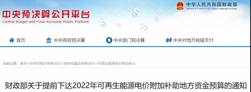 11 月 16日,中央預(yù)算公共平臺發(fā)布“關(guān)于提前下達(dá)2022年可再生能源電價附加補助地方資金預(yù)算的通知”。根據(jù)通知,本次下達(dá)總計新能源補貼資金38.7億元。其中,風(fēng)電15.5億元、光伏22.8億元、生物質(zhì)3824萬元。