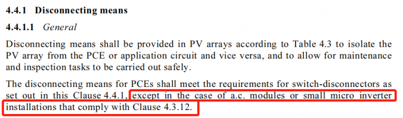 根據(jù)AS/NZS 5033:2014標(biāo)準(zhǔn)中提到:對(duì)非交流組件或小型微型逆變器安裝的系統(tǒng)而言,組件和逆變器之間需要安裝斷開(kāi)裝置;對(duì)交流組件或小型微型逆變器安裝的系統(tǒng)則不需要安裝直流側(cè)斷開(kāi)裝置。