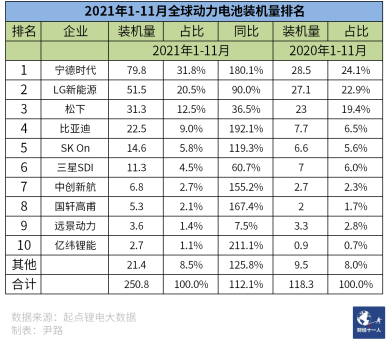 但優(yōu)勢的確立主要得益于中國新能源市場的擴張。寧德時代2021年1-11月的裝機量增量總量為51.3GWh,而中國市場貢獻的增量為40.93GWh,貢獻了整體增量的79.79%。而同期中國市場動力電池裝機總量為128.3GWh,占全球250.8GWh的51.16%。這些數(shù)據(jù)顯示,寧德時代的高速增長依賴于中國市場的快速擴張。