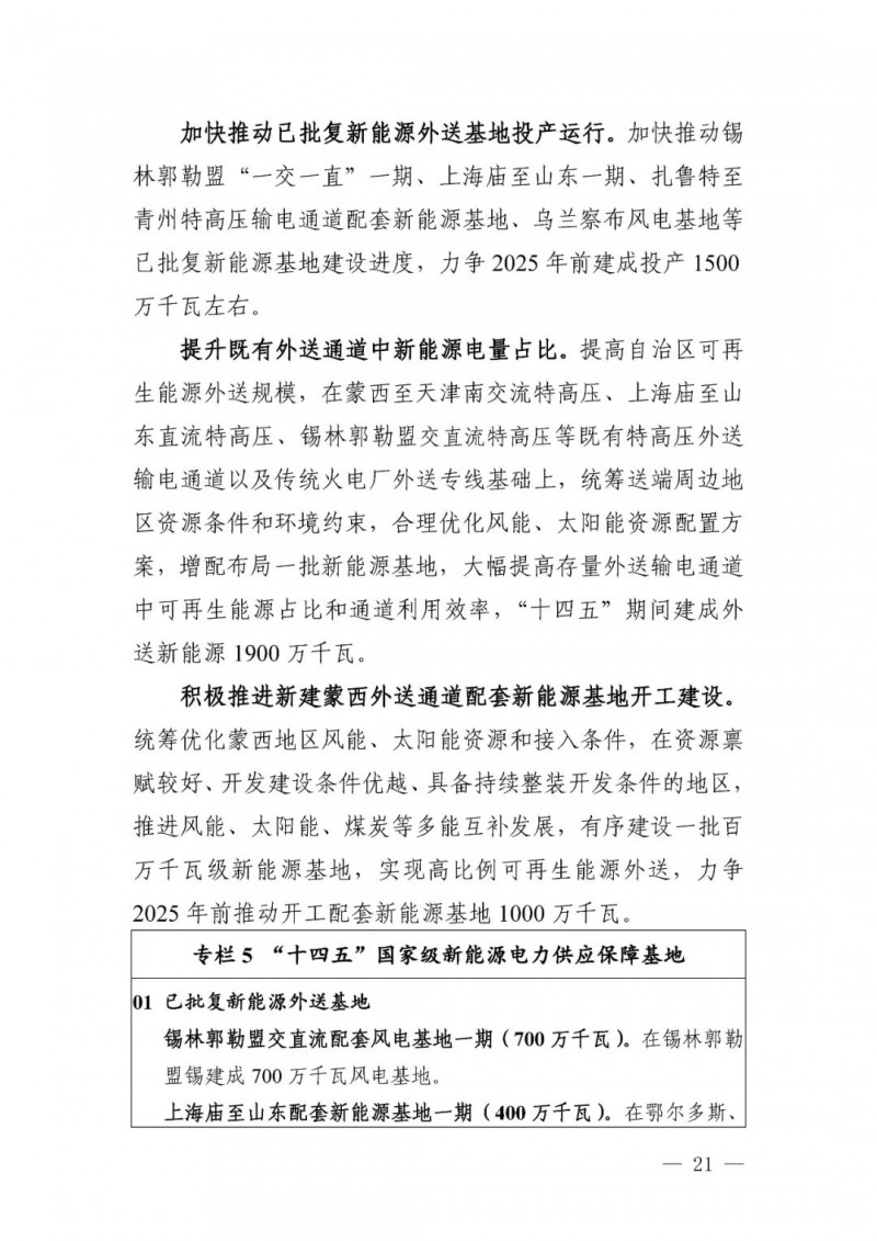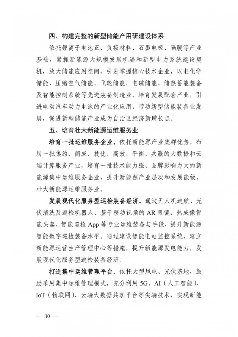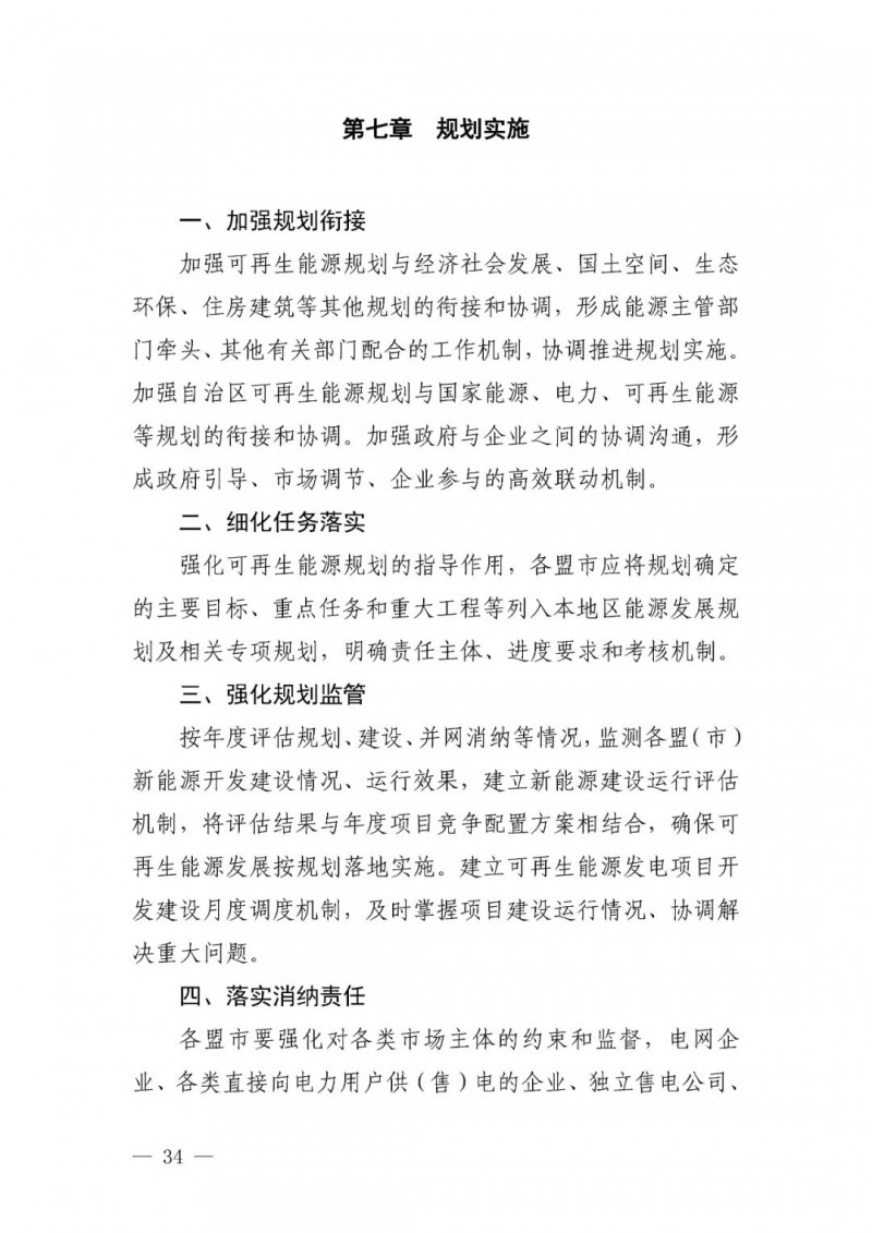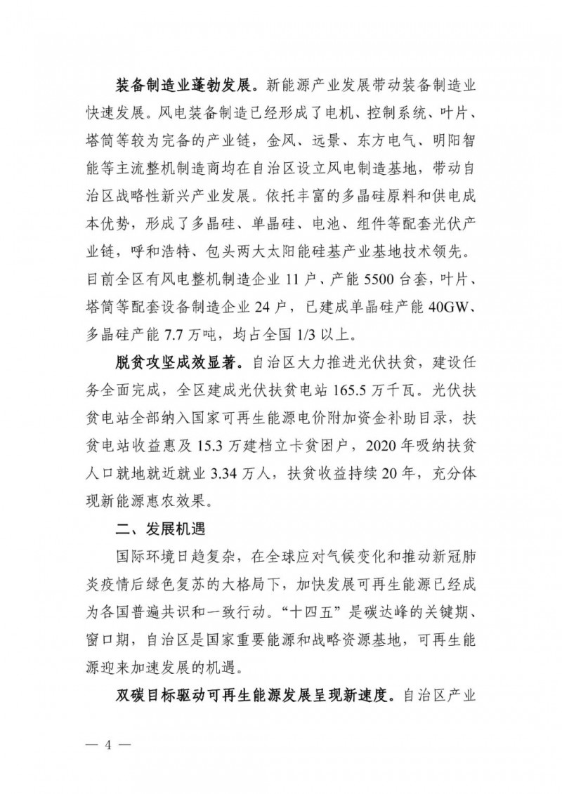 可再生能源發(fā)電目標。自治區(qū)可再生能源發(fā)電裝機達到 1.35 億千瓦以上,其中風電 8900 萬千瓦、光伏發(fā)電 4500 萬千瓦,新能源裝機規(guī)模超過燃煤火電裝機規(guī)模,新能源發(fā)電量占自治區(qū)總發(fā)電量比重超過35%。“十四五”期間可再生能源新增裝機 8000 萬千瓦以上,占全部新增裝機的比重超過 60%,成為新增裝機的主力。