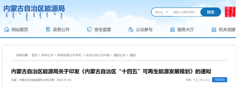 2022年3月2日,內(nèi)蒙古自治區(qū)能源局關(guān)于印發(fā)《內(nèi)蒙古自治區(qū)“十四五”可再生能源發(fā)展規(guī)劃》,提出:"十四五"末,內(nèi)蒙古可再生能源發(fā)電裝機(jī)達(dá)到 1.35 億千瓦以上,其中風(fēng)電 8900 萬(wàn)千瓦、光伏發(fā)電 4500 萬(wàn)千瓦,相當(dāng)于新增風(fēng)電項(xiàng)目5115萬(wàn)千瓦,光伏項(xiàng)目3262萬(wàn)千瓦,共8377萬(wàn)千瓦,包含本地消納和外送兩類(lèi)。平均利用率保持在 90%以上。同時(shí),將依據(jù)國(guó)土空間規(guī)劃,完善可再生能源空間用途管制規(guī)則,保障可再生能源開(kāi)發(fā)利用合理的用地空間需求。落實(shí)草原林地征占用分區(qū)管控政策,保障可再生能源項(xiàng)目使用草原林地需求。規(guī)范土地性質(zhì)認(rèn)定,明確林草等不同地類(lèi)的用地標(biāo)準(zhǔn)。