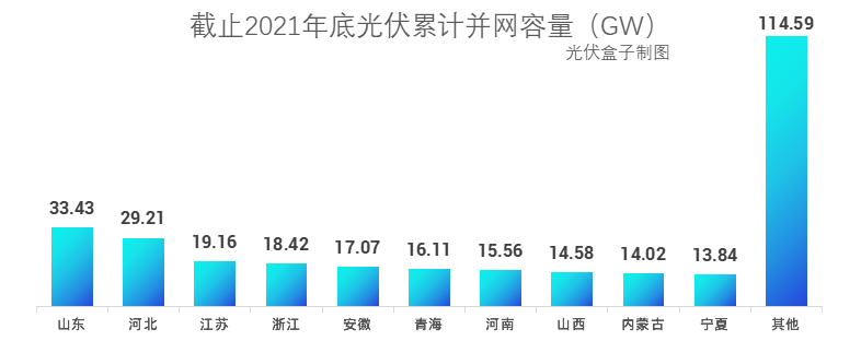 截至2021年底,累計光伏裝機容量排名前3的省份分別是山東省(33.43GW)、河北省(29.21GW)、江蘇省(19.16GW)。