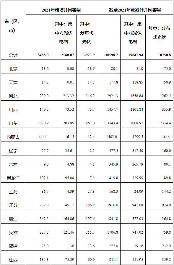 國家能源局公布2021年光伏發(fā)電建設運行情況,2021年我國光伏發(fā)電新增并網(wǎng)容量54.88GW,其中集中式光伏電站新增25.6007GW、分布式光伏電站29.279GW。