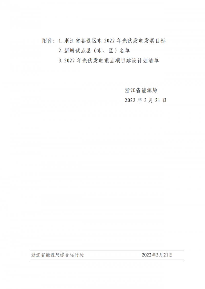除此外,浙江省能源局要求持續(xù)加快分布式光伏建設(shè),并擴(kuò)大整縣(市、區(qū))屋頂分布式光伏開發(fā)試點(diǎn)建設(shè)范圍,新增36個整縣試點(diǎn)名單,列入試點(diǎn)名單縣(市、區(qū))2022年光伏新增不得少于50MW,總規(guī)模為1.8GW。