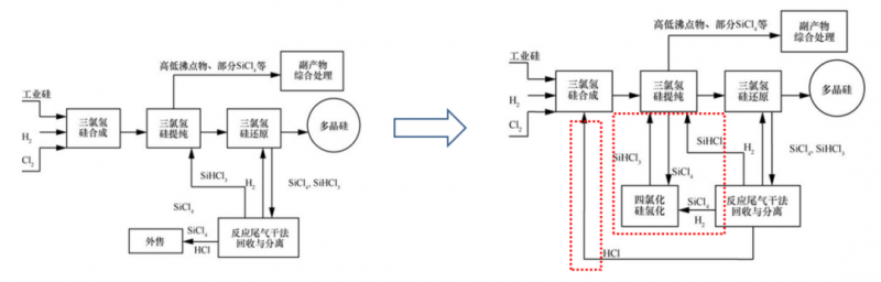 由于改良西門子法生成的副產(chǎn)物和尾氣較多,影響到生產(chǎn)成本。如何有效循環(huán)和處理產(chǎn)物關(guān)系到未來的降本方向。比如西門子法生產(chǎn)過程中會(huì)產(chǎn)生大量的副產(chǎn)物SiCl4,將SiCl4轉(zhuǎn)化成作為多晶硅生產(chǎn)原料的SiHCl3,從而實(shí)現(xiàn)閉環(huán)生產(chǎn),以提高硅粉利用率,降低生產(chǎn)成本。