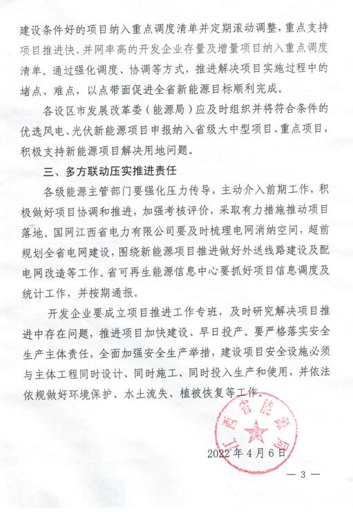 2022年4月6日,江西省能源局就加快我省新能源項目建設(shè)有關(guān)事項進(jìn)行了通知,通知包含以下內(nèi)容:1.加快推進(jìn)新能源項目建設(shè);2.建立重點項目調(diào)度機制;3.多方聯(lián)動壓實推進(jìn)責(zé)任。
