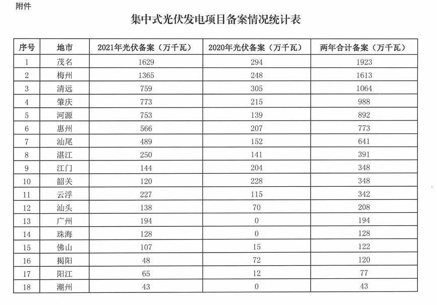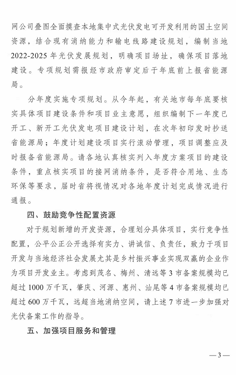 4.鼓勵(lì)競爭性配置資源:考慮到茂名、梅州、清遠(yuǎn)等3市備案規(guī)模均已超過1000萬千瓦,肇慶、河源、惠州、汕尾等4市備案規(guī)模均已超過600萬千瓦,遠(yuǎn)超當(dāng)?shù)叵{空間,請(qǐng)上述7市進(jìn)一步加強(qiáng)對(duì)光伏備案工作的指導(dǎo)。