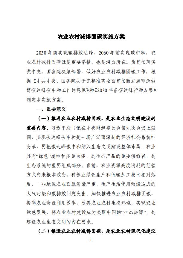 為貫徹落實碳達(dá)峰碳中和重大決策部署,推進農(nóng)業(yè)農(nóng)村綠色低碳發(fā)展,我們制定了《農(nóng)業(yè)農(nóng)村減排固碳實施方案》,現(xiàn)印發(fā)你們,請結(jié)合實際貫徹落實。