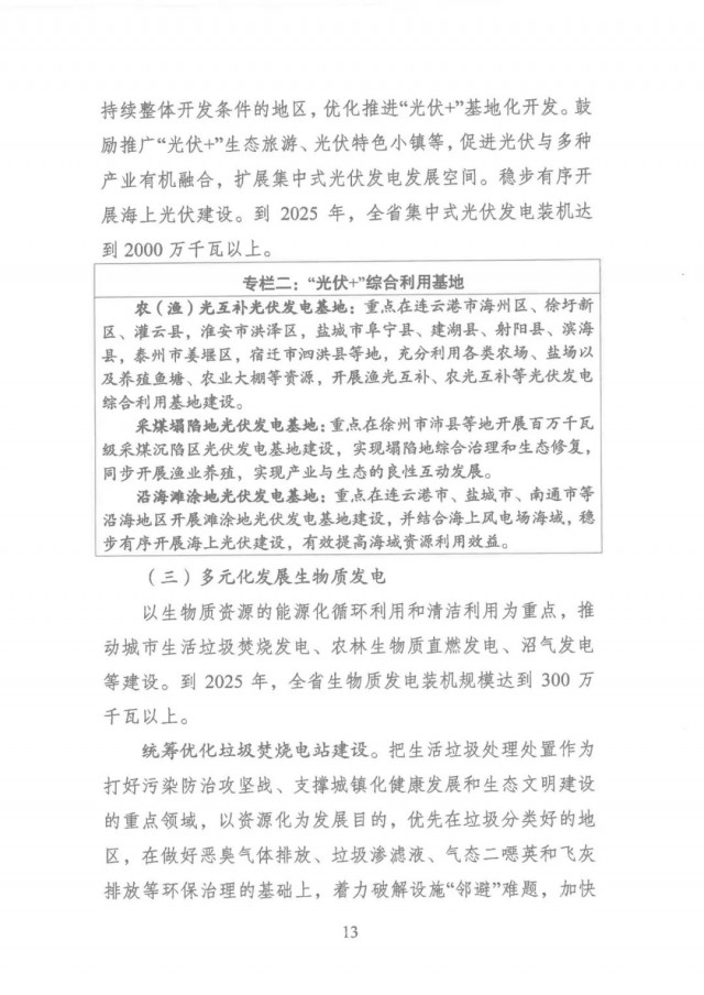 “十四五”期間,江蘇將穩(wěn)妥有序推進風(fēng)電發(fā)展,優(yōu)化風(fēng)電發(fā)展結(jié)構(gòu),重點發(fā)展海上風(fēng)電,因地制宜發(fā)展光伏發(fā)電,全力推進分布式光伏發(fā)電,穩(wěn)步有序開展海上光伏建設(shè),加快推進“光伏+”綜合利用,多元化發(fā)展生物質(zhì)發(fā)電,科學(xué)推進抽水蓄能開發(fā),高效多元推動非電利用。到2025年,省內(nèi)可再生能源占全省能源消費總量比重將達到15%以上,全省可再生能源裝機達到6600萬千瓦以上,占總裝機比重超過34%。其中,風(fēng)電裝機達到2800萬千瓦以上,光伏發(fā)電裝機達到3500萬千瓦以上,生物質(zhì)發(fā)電裝機達到300萬千瓦以上。
