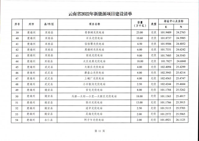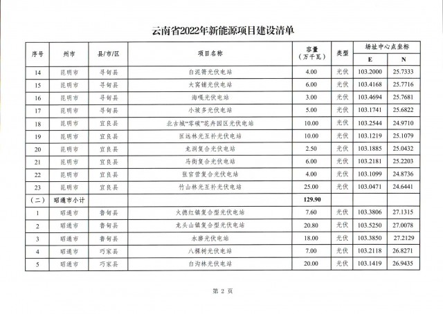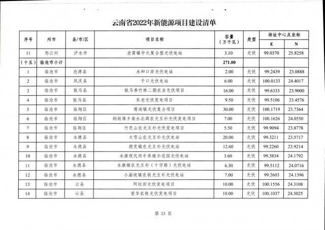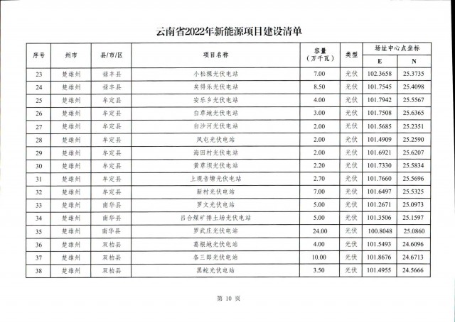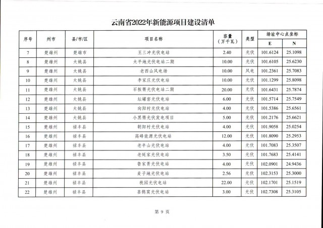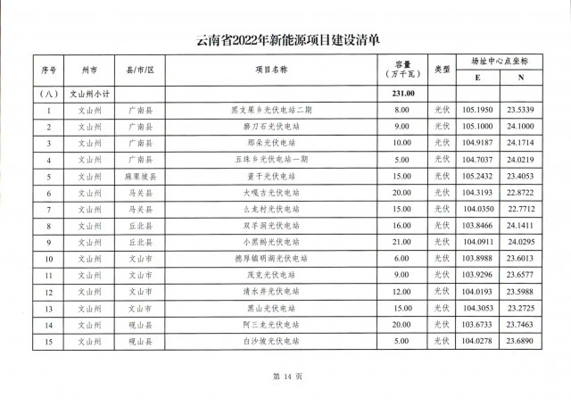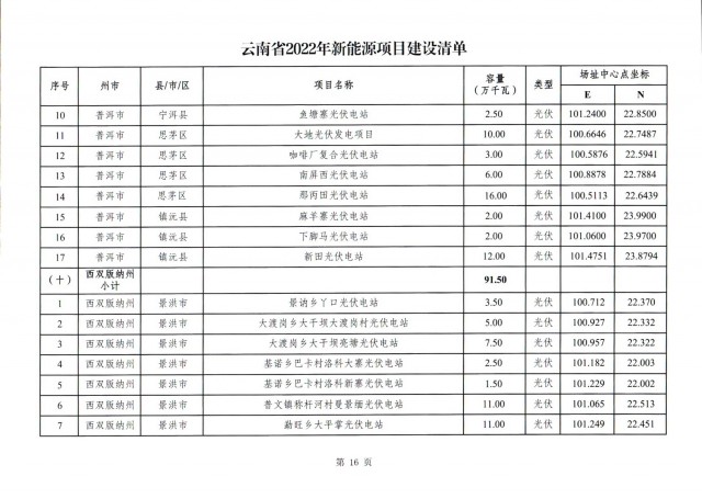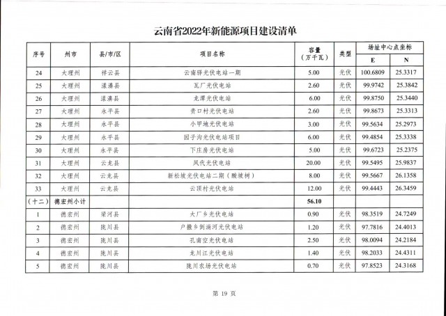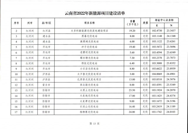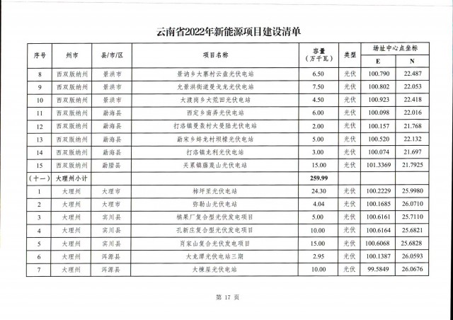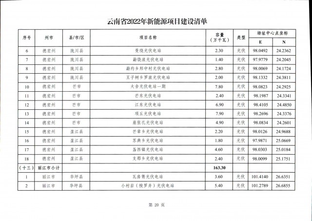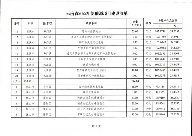 根據(jù)項目清單來看(附件查看清單),昆明市193.8萬千瓦、昭通市129.9萬千瓦、曲靖市440.6萬千瓦、玉溪市216.89萬千瓦、保山市194.8萬千瓦、楚雄州556.46萬千瓦、紅河州206.6萬千瓦、文山州231萬千瓦、普洱市101.5萬千瓦、西雙版納州91.5萬千瓦、大理州259.99萬千瓦、德宏州56.1萬千瓦、麗江市163.3萬千瓦、怒江州87.1萬千瓦、臨滄市271萬千瓦。